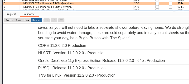 . This signifies that Oracle DB is in use. - From the payload, banner is displayed in both columns. Hence we know that there are two columns and both can display strings.