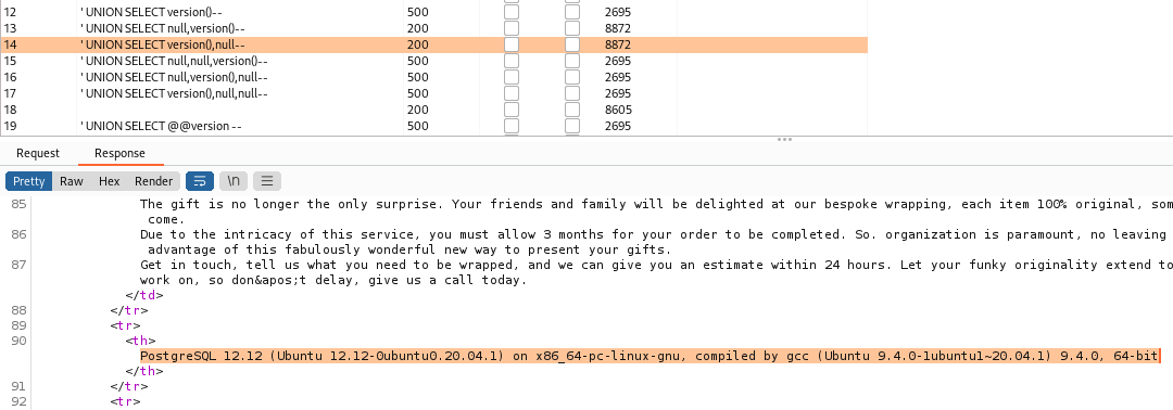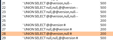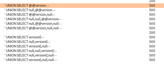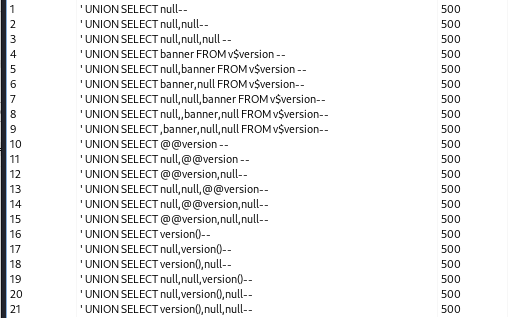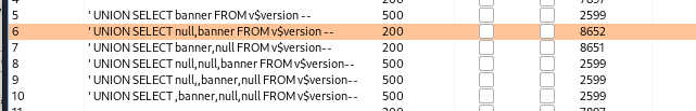Likewise, we will use the same payload list used above as well as burp intruder to enumerate the database version.