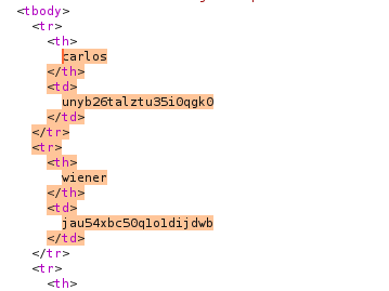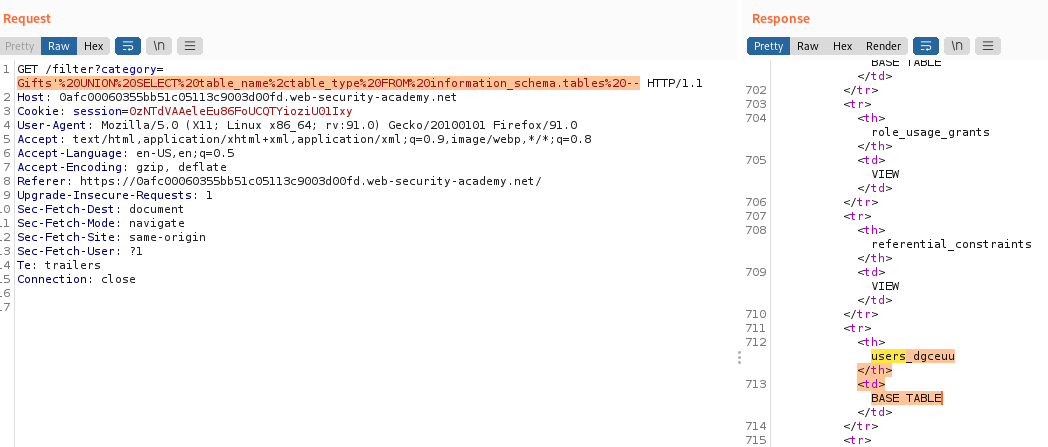 - The application has a login function, and the database contains a table that holds usernames and passwords. You need to determine the name of this table and the columns it contains, then retrieve the contents of the table to obtain the username and password of all users.